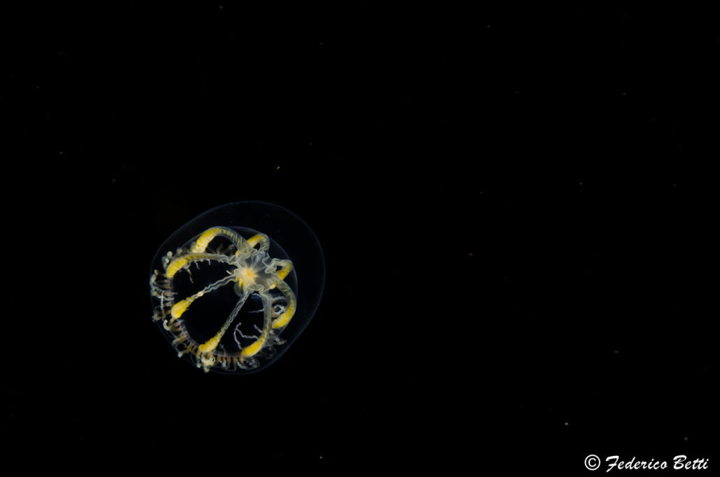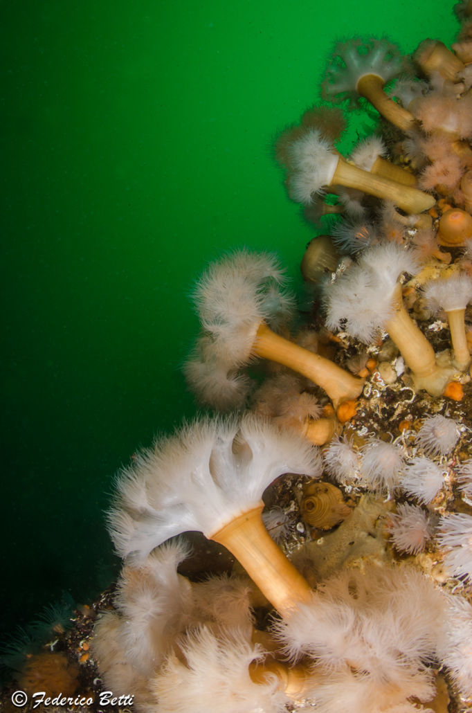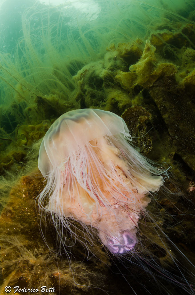 Tipica di acque fredde boreali, la incontriamo sovente durante le nostre immersioni, mentre si lascia trasportare nell’acqua verde con i tentacoli espansi alla corrente, un grosso predatore che pattuglia il suo immenso regno.