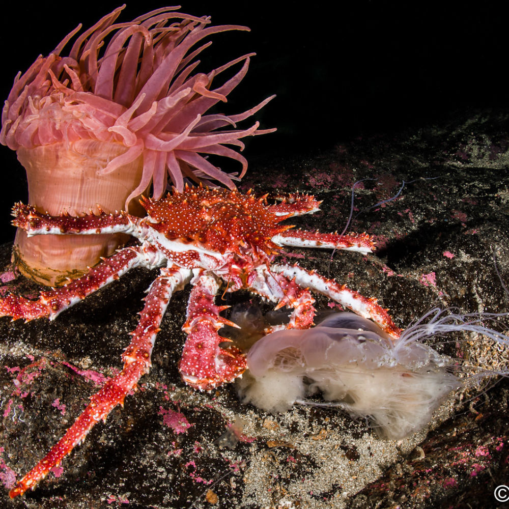Un grosso king crab si sta cibando dei resti di una medusa criniera di leone