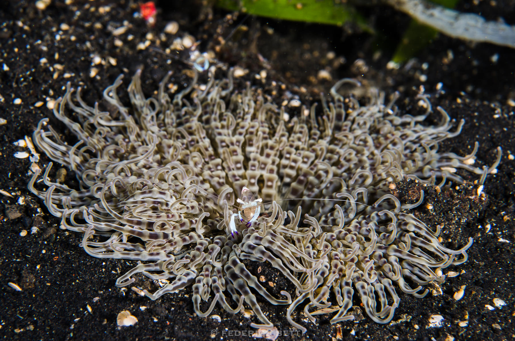 Protezione dai predatori in cambio di un servizio di pulizia: è questa la base di molte simbiosi mutualistiche, come quelle tra grandi anemoni di mare, dotate di tentacoli urticanti, e gamberetti, molto portati per loro natura alla rimozione di detrito e scarti di cibo intrappolati nel loro ospite. Qui il gamberetto indopacifico Ancylomenes magnificus si affaccia indagatore dal suo rifugio, l’anemone di sabbia Heteractis aurora.